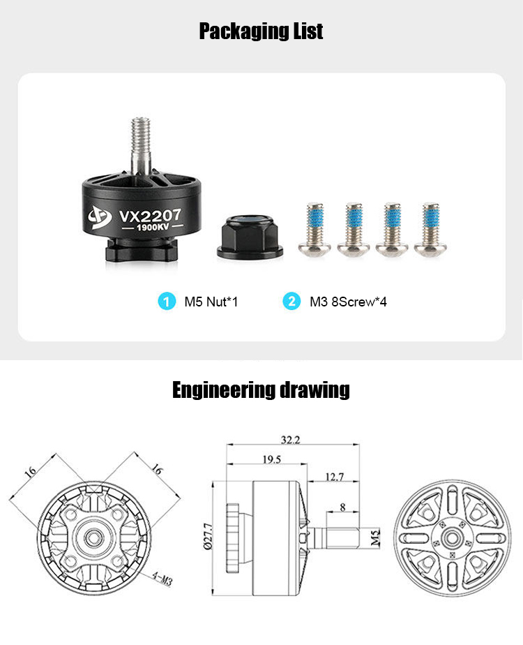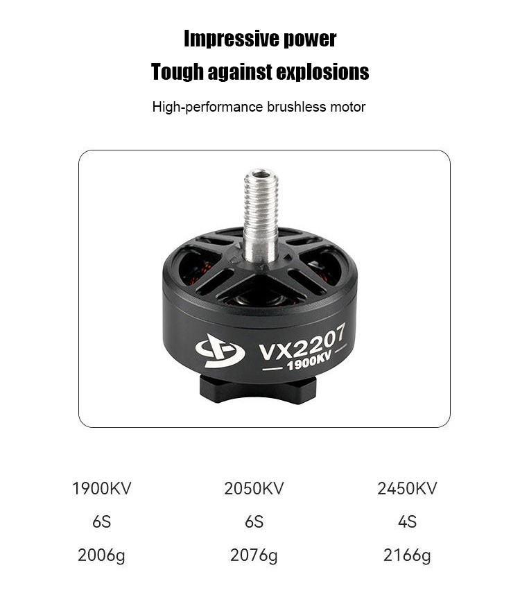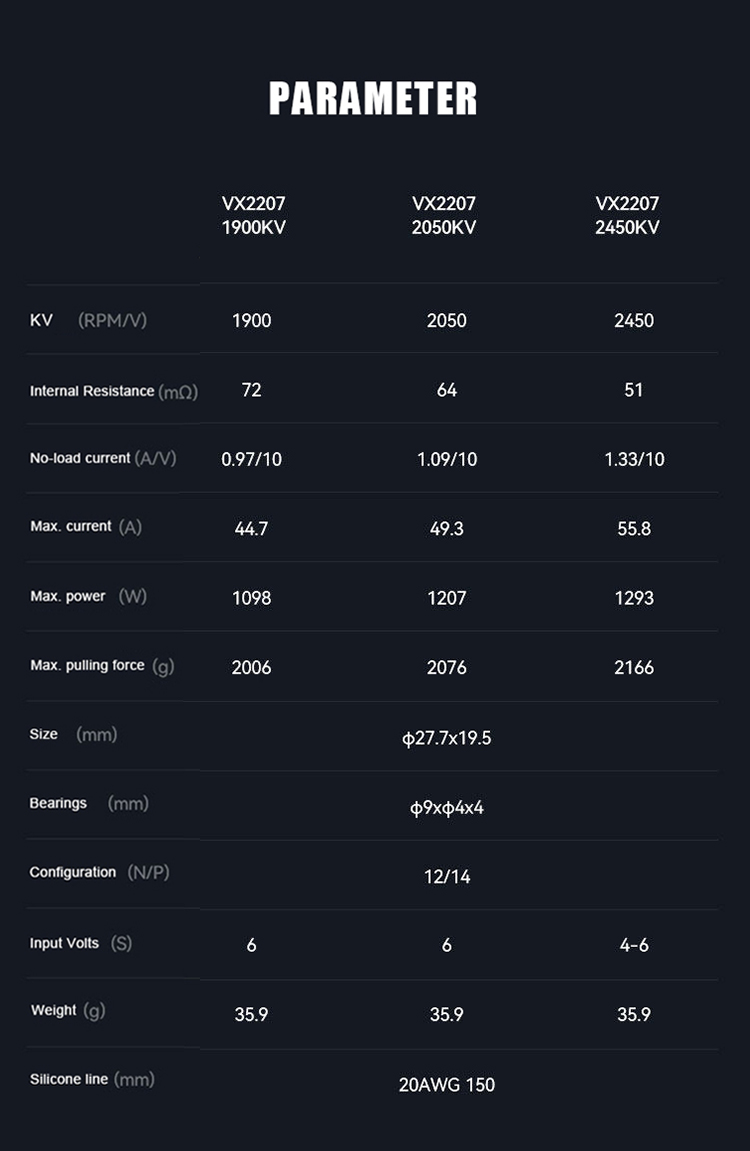 Type : TOP2207 KV(RPM/V) : 1900KV 2050KV 2450KV Max force : 2166g Input Voits : 4-6s Applcation : 5-6 inch FPV Size : 27.7 * 19.7mm Weight : 35.9g