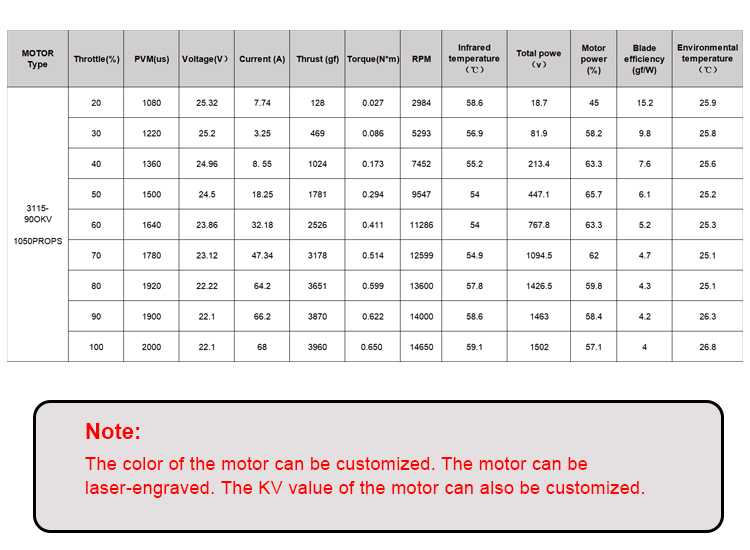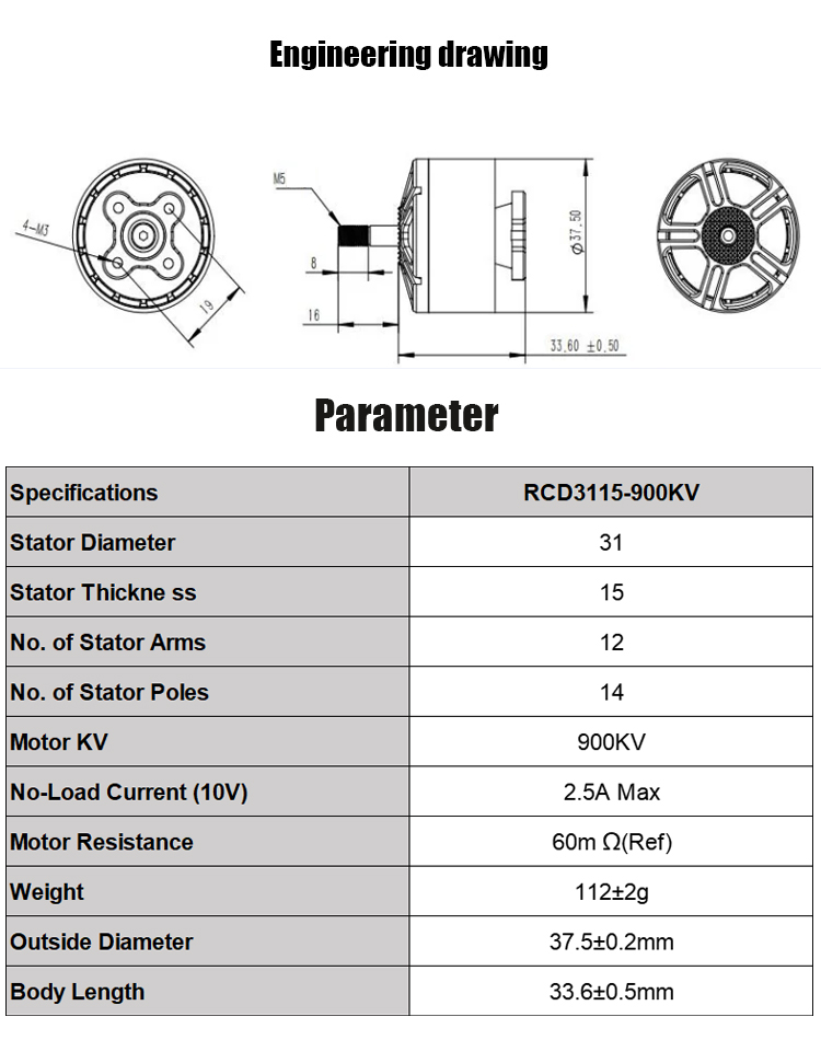 Type : TOPR3115 KV(RPM/V) :900KV Max force :3960g Input Voits : 3-6s Applcation : 7-8 inch FPV Size : 37.5 * 33.6mm Weight :112g
