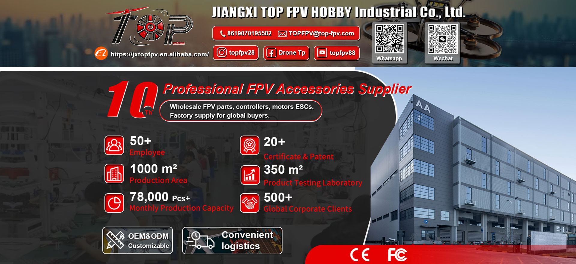 Specializes in R&D and manufacturing of core FPV dronecomponents:flight towers, propellers, brushless motors, etc.We provide OEM customization for cameras and videotransmission systems