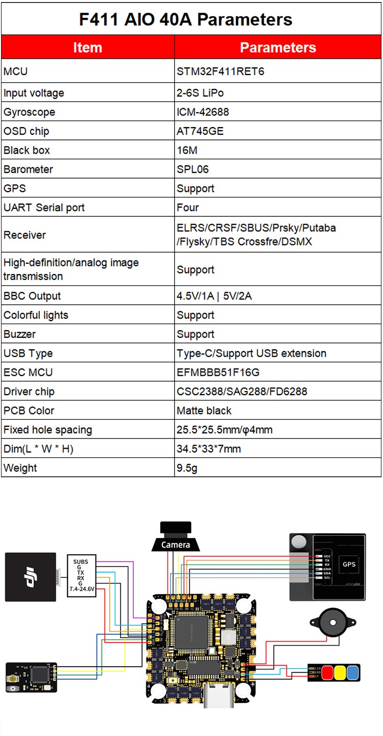 Type : TOP F411 40A AIO Input Voits : 2-6s Size : 34.5*33*7mm Weight : 9.5g