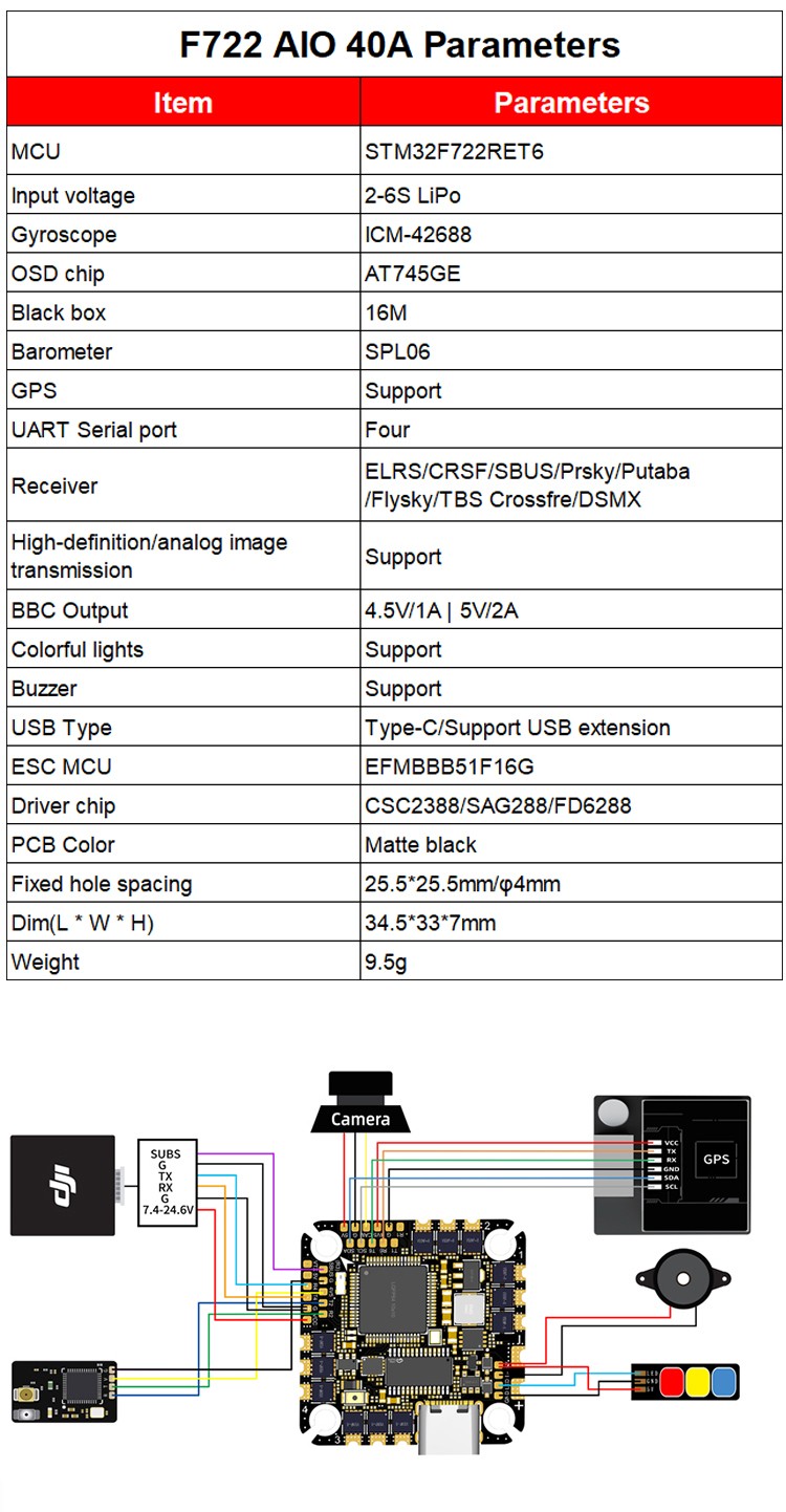 Type : TOP F722 40A AIO Input Voits : 2-6s Size : 34.5*33*7mm Weight : 9.5g