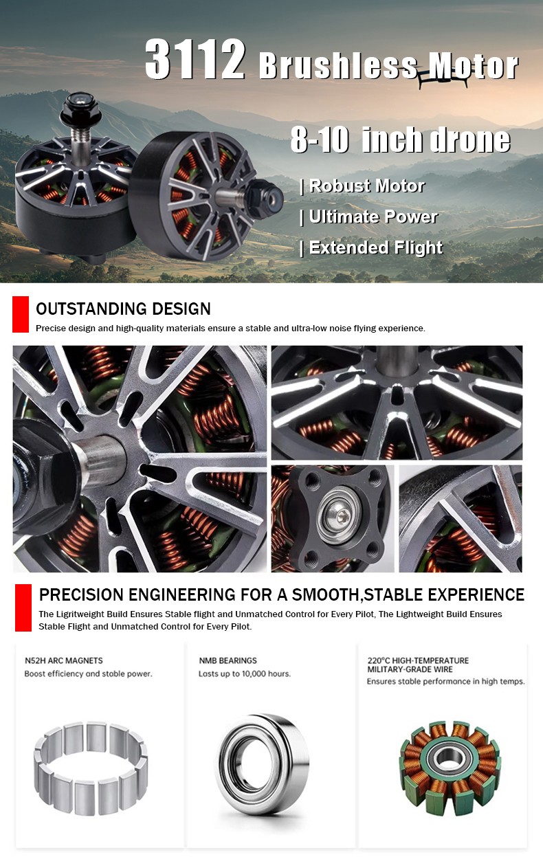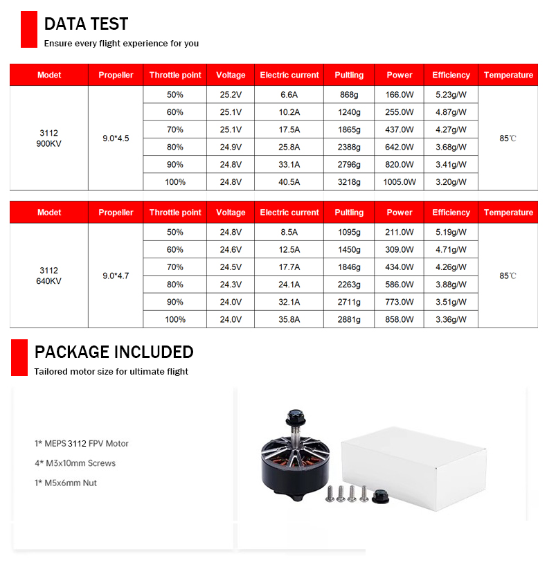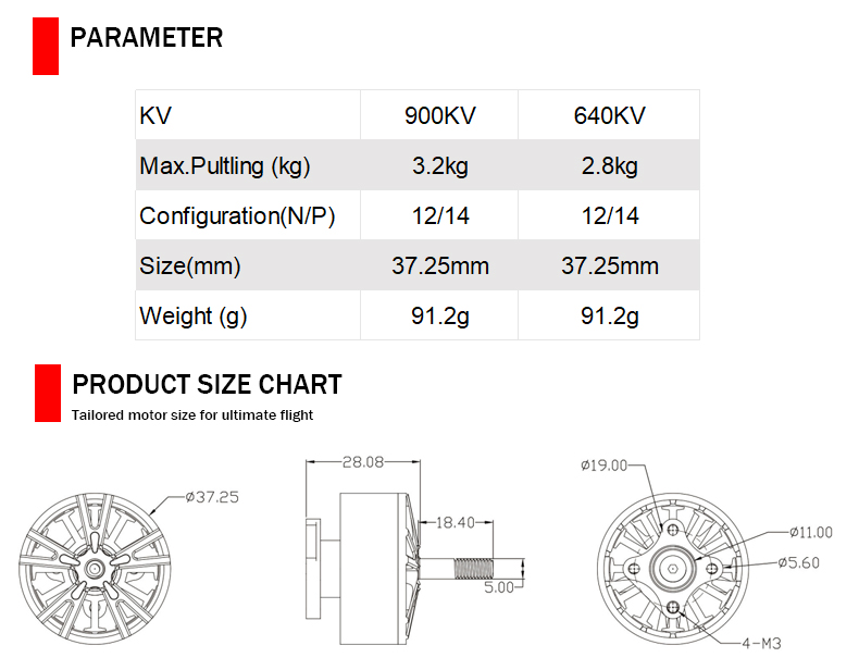 Type : TOPR3112 KV(RPM/V) :640KV / 900KV Max force : 3.2kg Configuration(N/P):12/14 Applcation : 8-10 inch FPV Size : 37.25mm Weight :91.2g