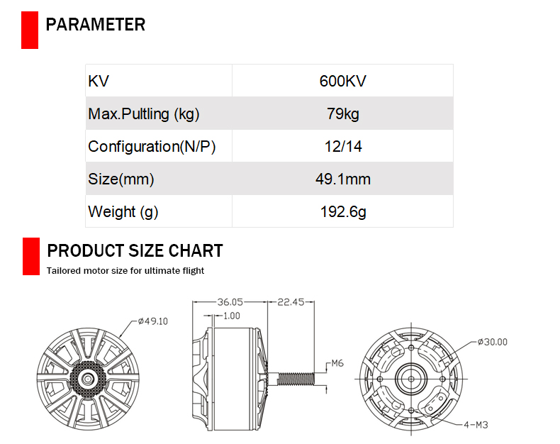 Type : TOP4214 KV:600KV Max.Pultling (kg):79kg Configuration(N/P):12/14 Size:49.1mm Weight:192.6g